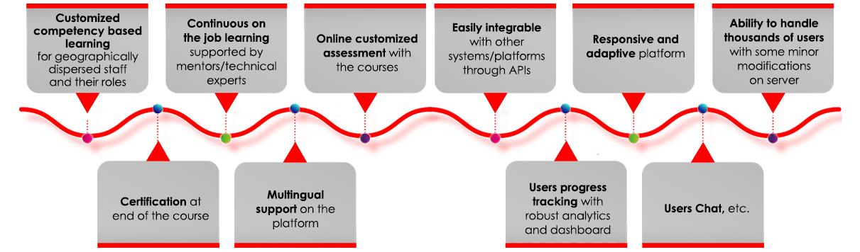 La plateforme est dotée de fonctionnalités en ligne et hors ligne qui permettront à l'utilisateur de télécharger et de visualiser le contenu en l'absence de connectivité réseau. La fonction de signet présente sur la plateforme permet à l'utilisateur de reprendre le cours au point où il l'aurait laissé lorsqu'il était hors ligne. Ainsi, les utilisateurs ne perdent pas leur progression (en raison de l'absence de connectivité) et l'administrateur peut également suivre les données une fois qu'ils sont de retour en ligne.